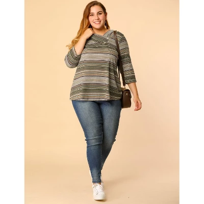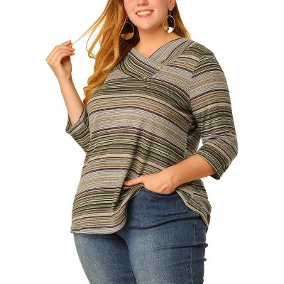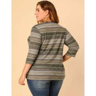 - V Neck with Button Decor, Stripe Print, 3/4 Sleeves, Knit Spring Tops