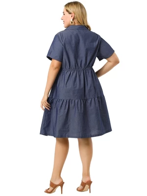 - The dress is in a regular fit with a turn-down collar, button front, elastic back, and midi-length denim dress