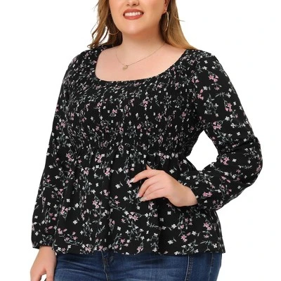 Agnes Orinda Women’s Plus Size Blouses Smock Waist Square Neck Floral Peplum Tops