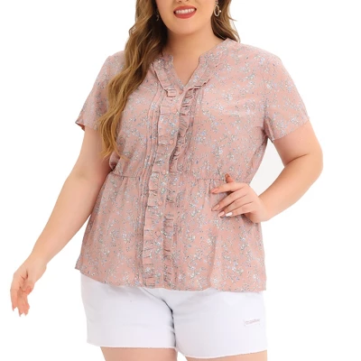- Lightweight woven polyester fabric creates a lived-in vibe across this chiffon flower peplum blouse with front ruffle trim V neck and short sleeves.