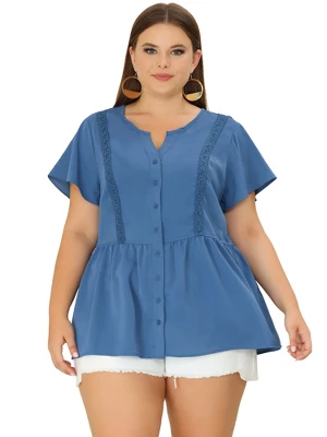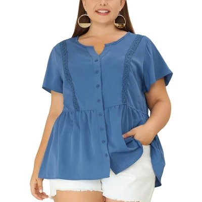 - This button down collar shirt is woven in relaxed fit with bell short sleeve and swing flowy hem