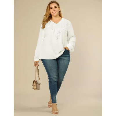 - Ruffle V Neck, Long Sleeves, Solid Color, Chiffon Ruffle Blouse